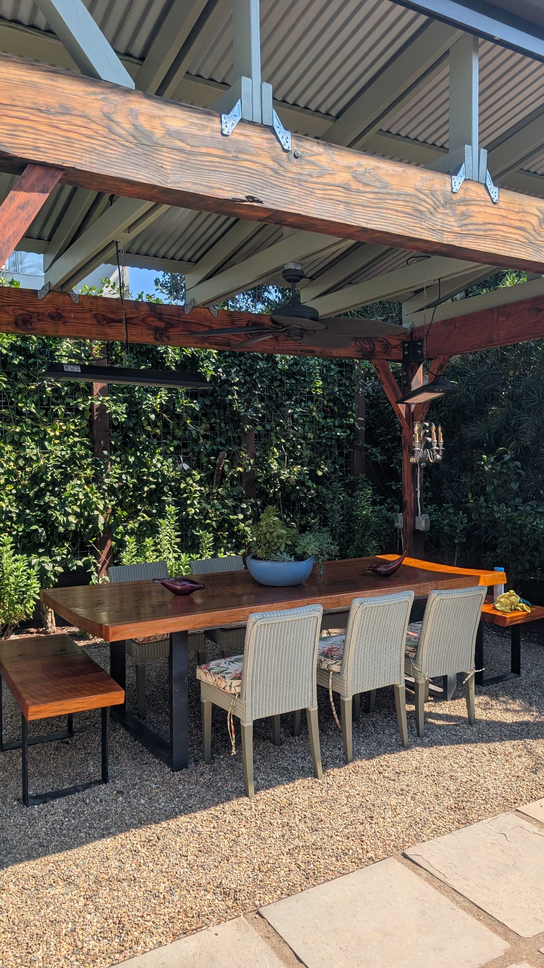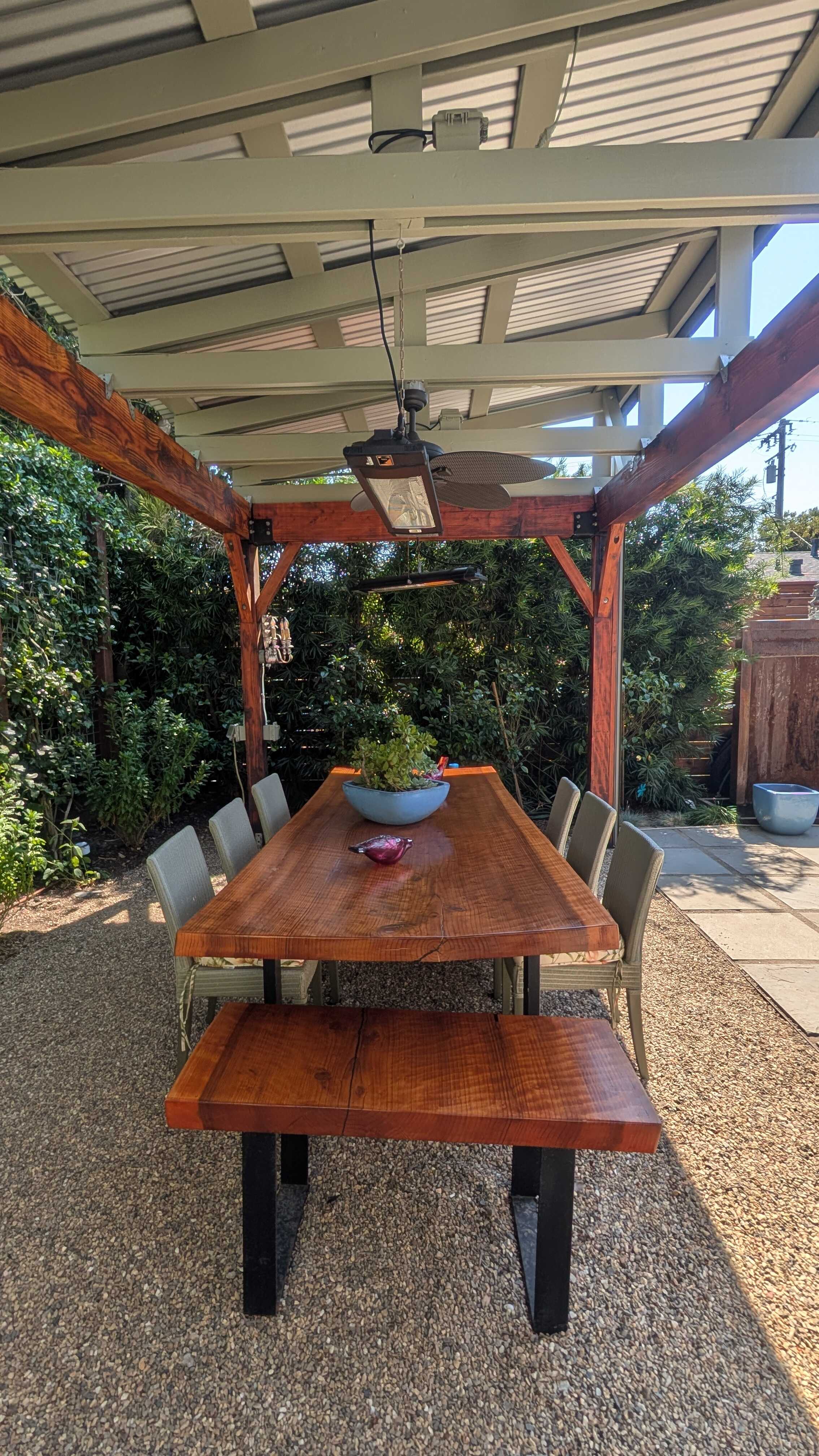 Hot tub, fire pit, and pergola with large outdoor dining table are just a few of the amenities of this property!