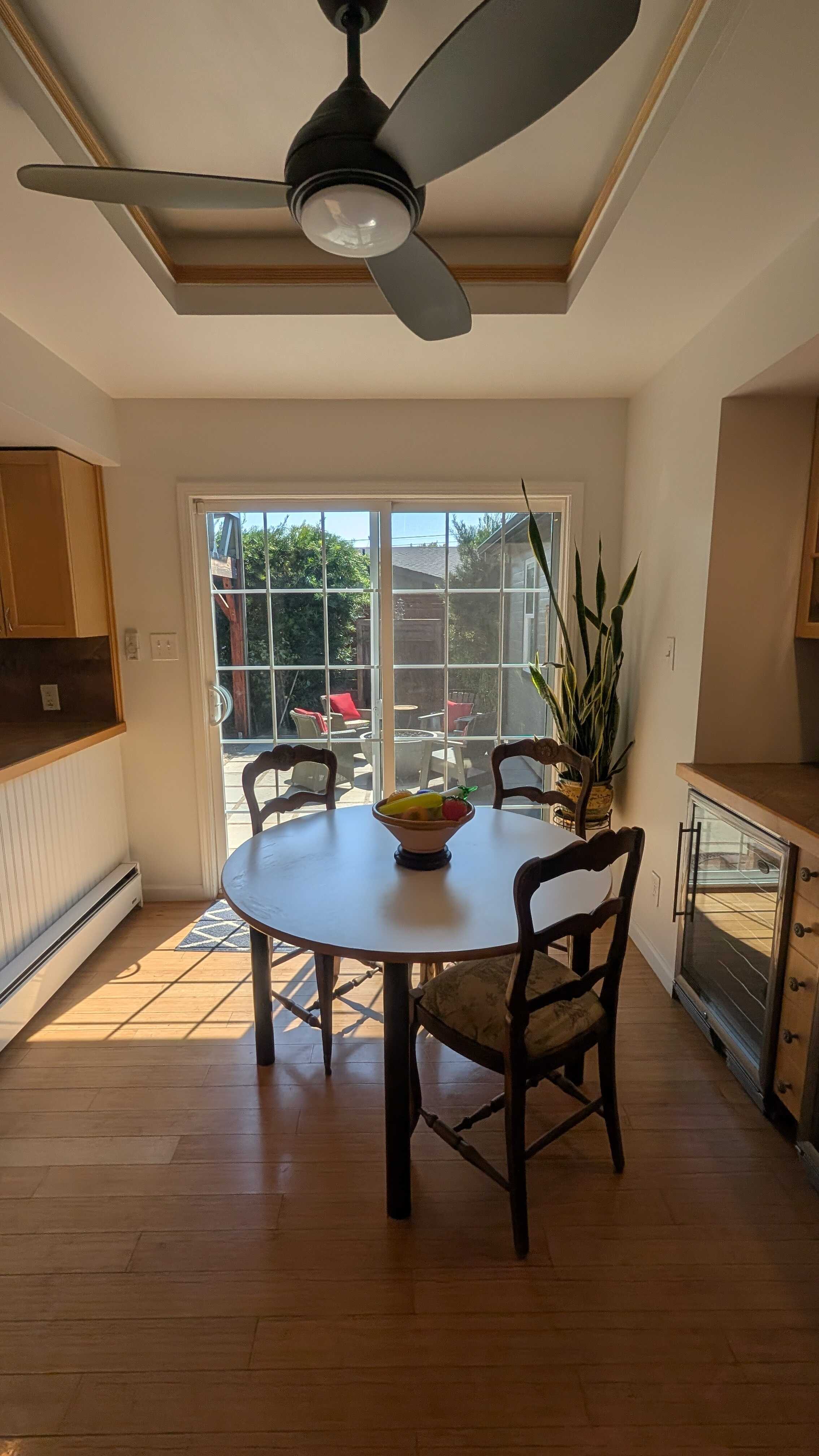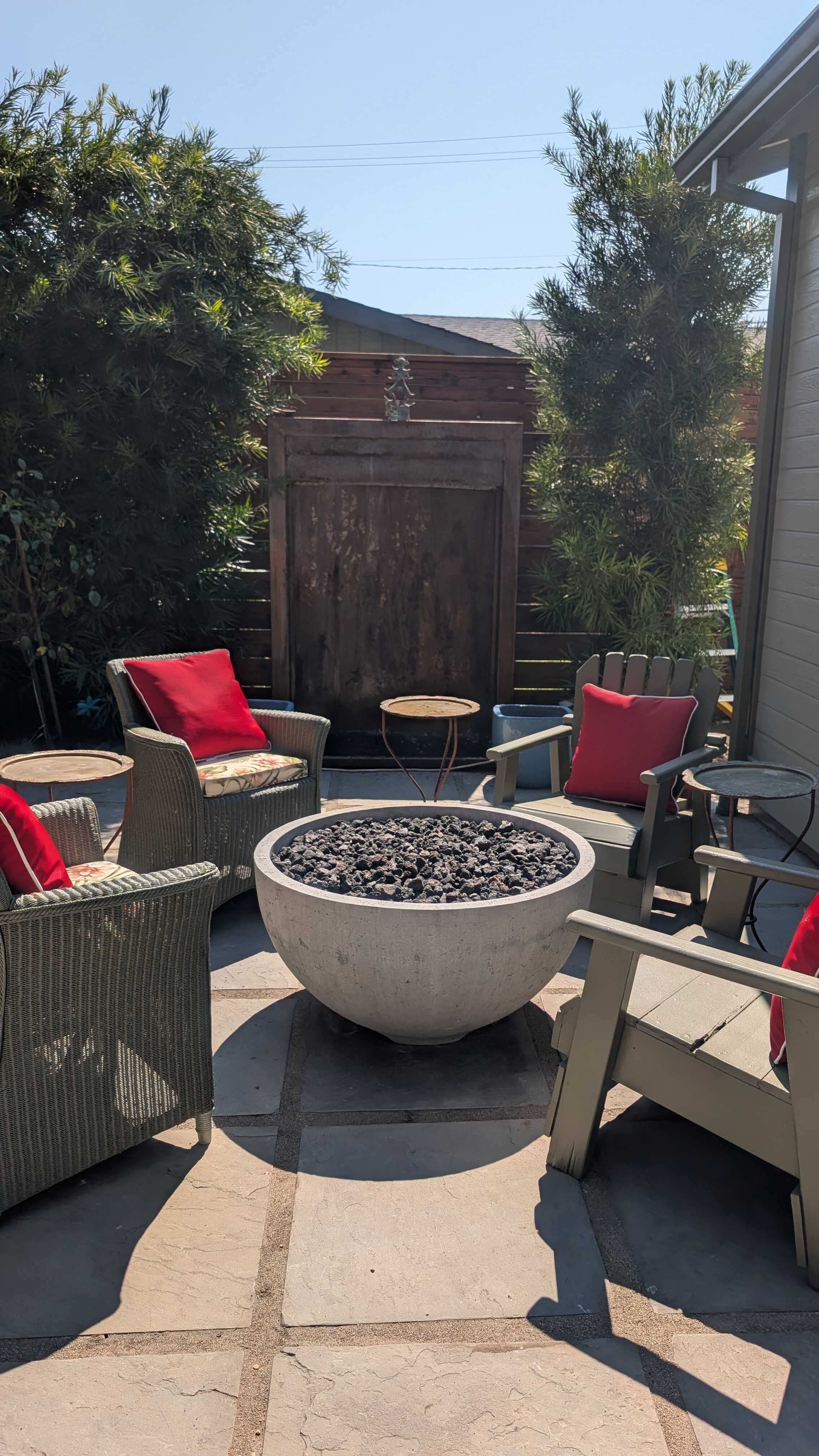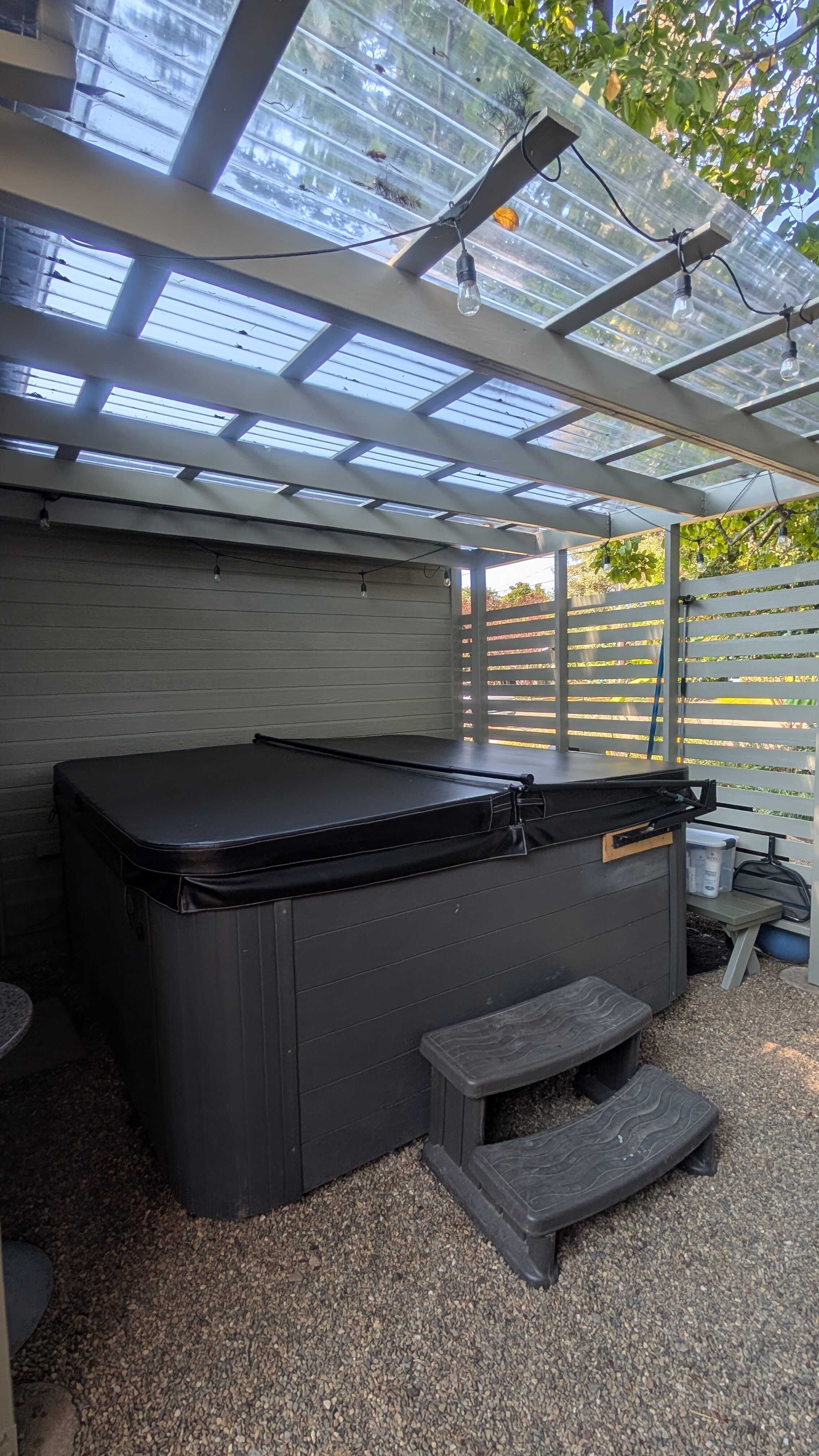 This private yard has a built in fire pit, large dining table that lives under a newly refinished pergola, and a spacious hot tub to enjoy!