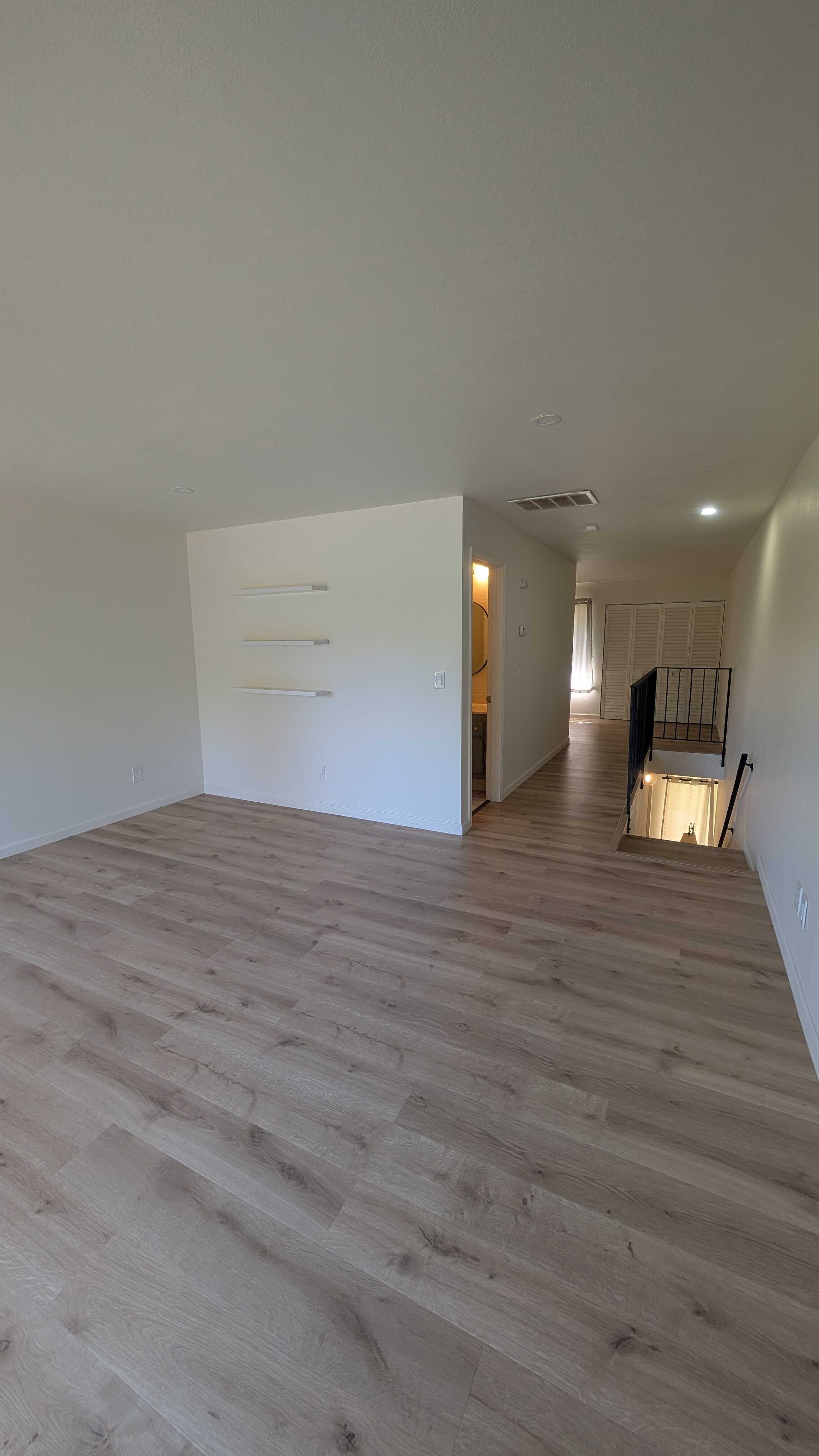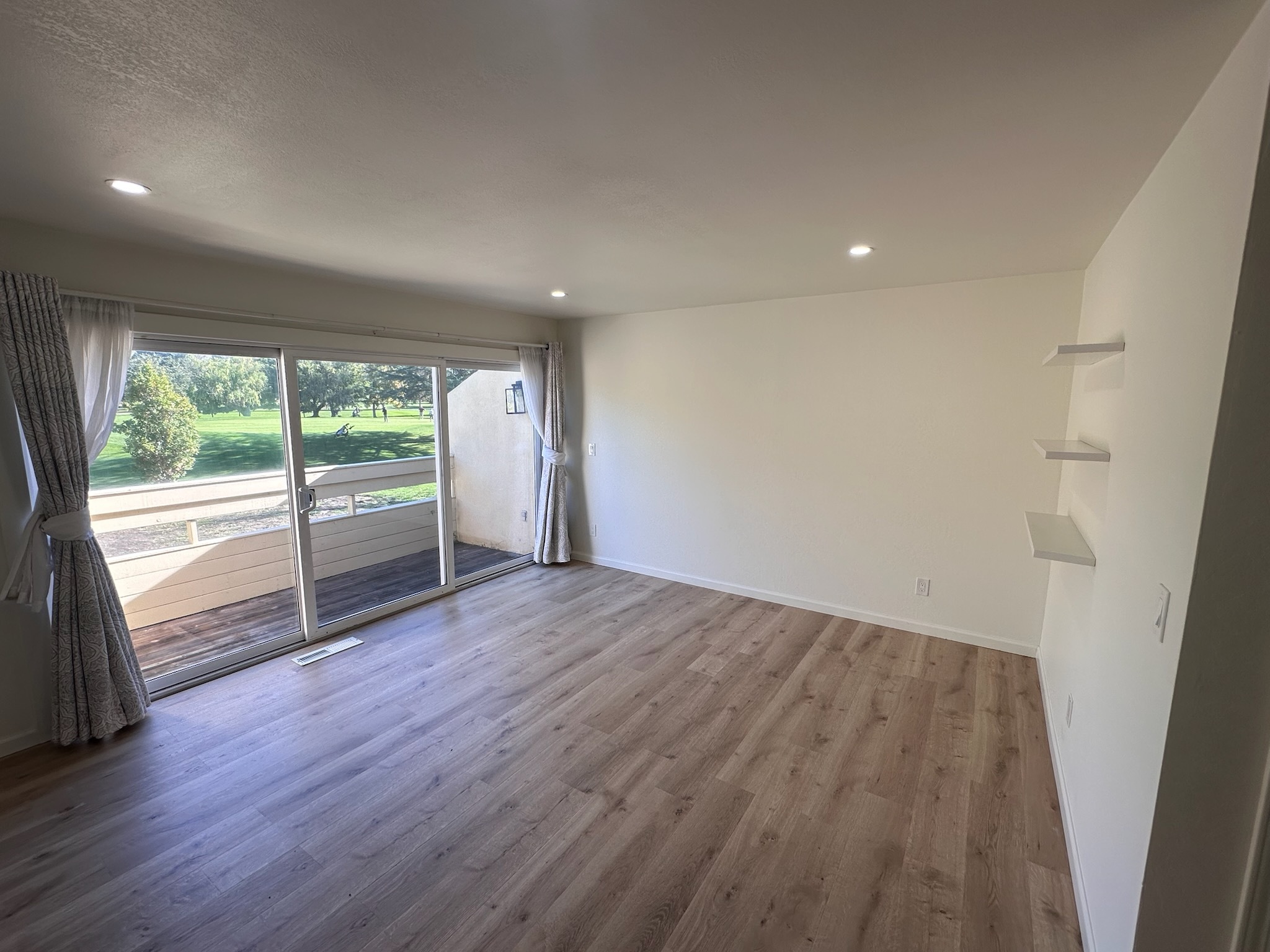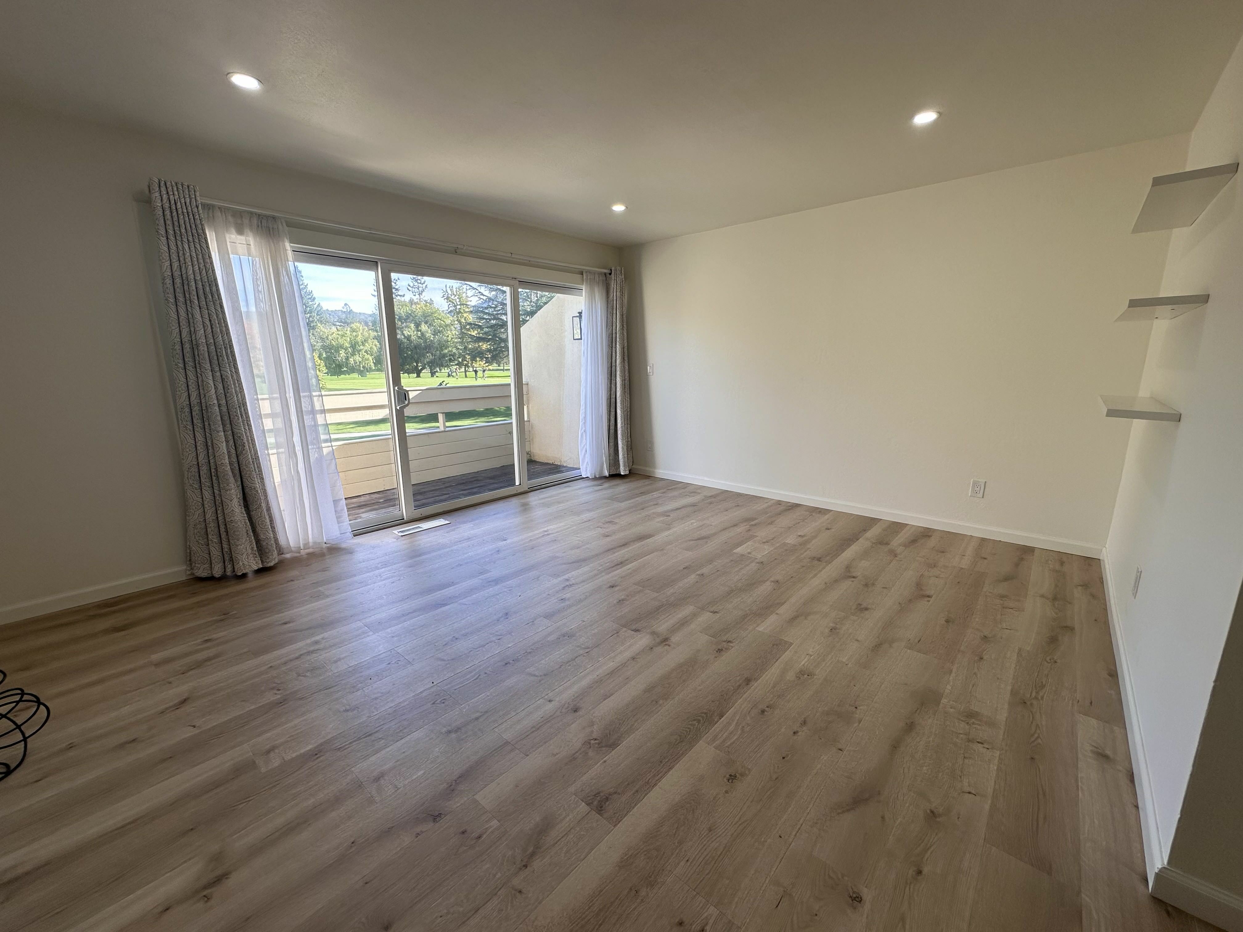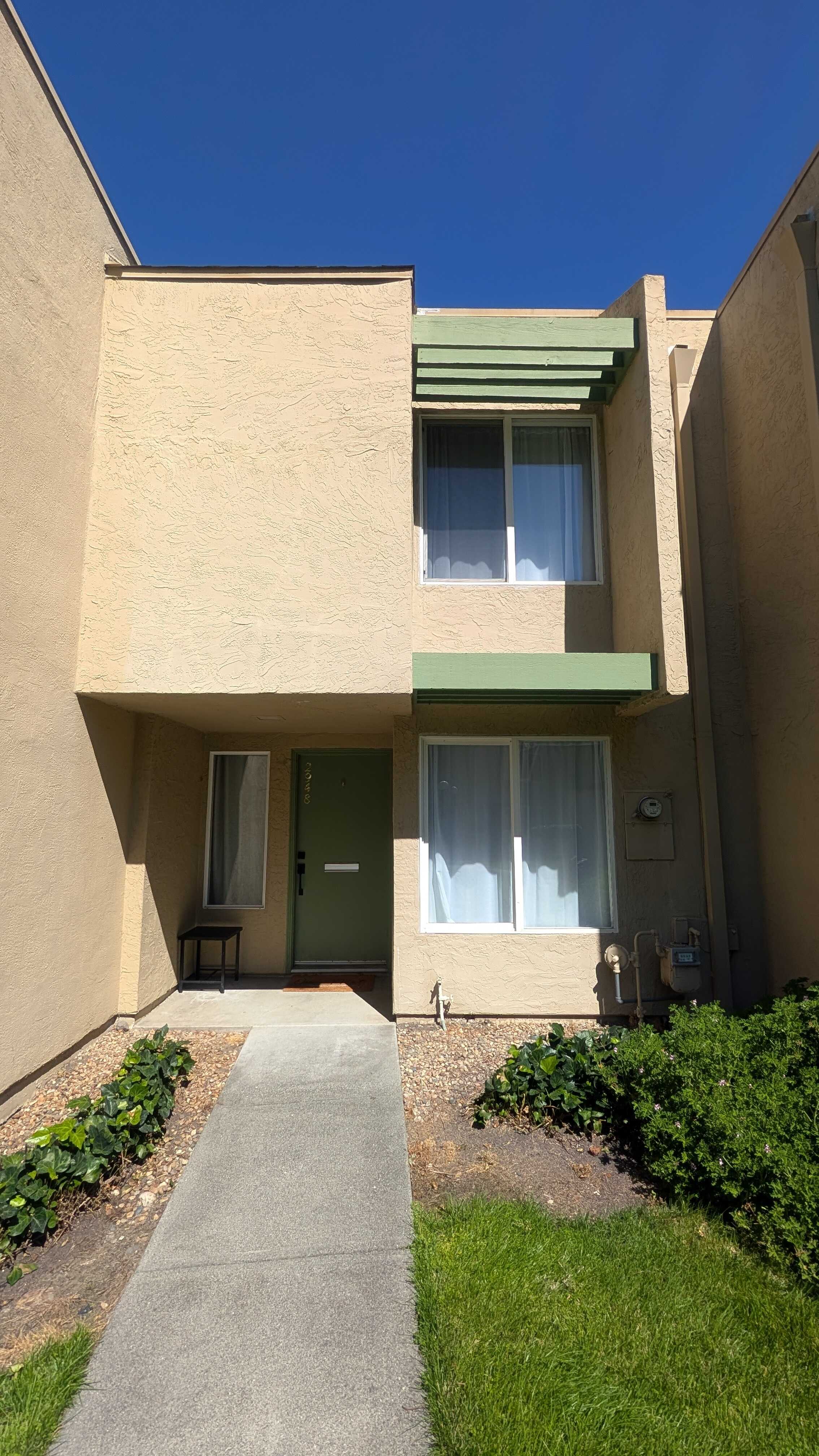Upon entering, you are greeted with the two bedrooms, one of which has a sliding glass door to its own private patio looking out to the golf course, plus the full bathroom. Large closets are downstairs for additional storage. As you make your way upstairs, there is a spacious living room with large glass sliding door allowing for abundant natural light and indoor outdoor living. The half bath and kitchen with pantry and dining space live just off the living room.
