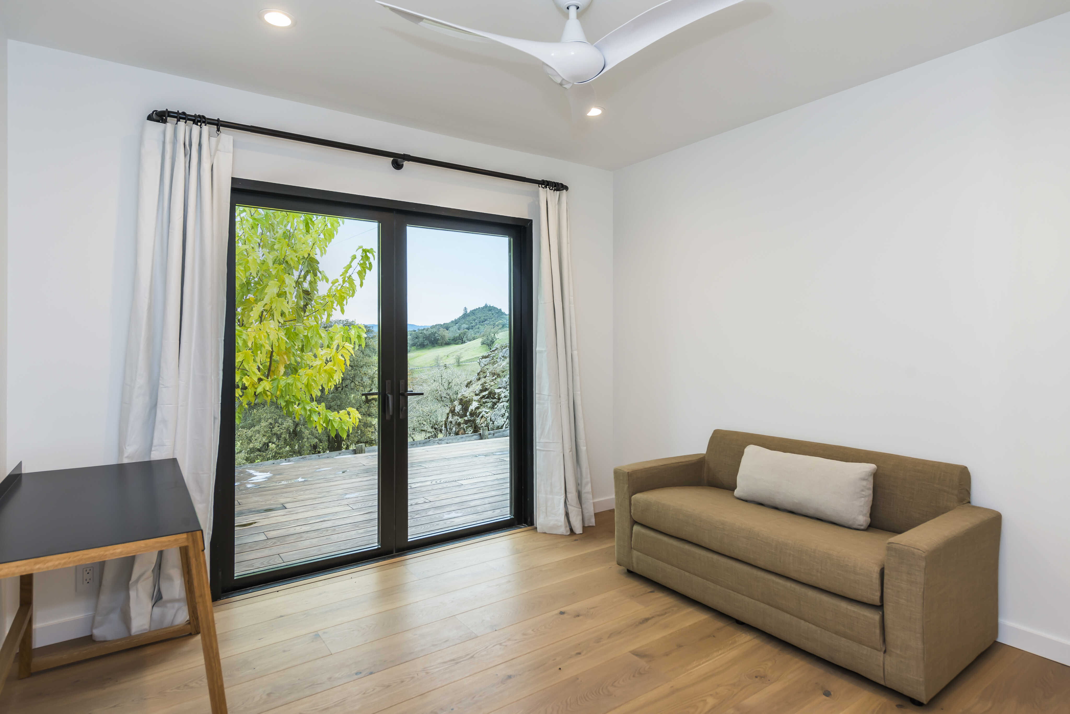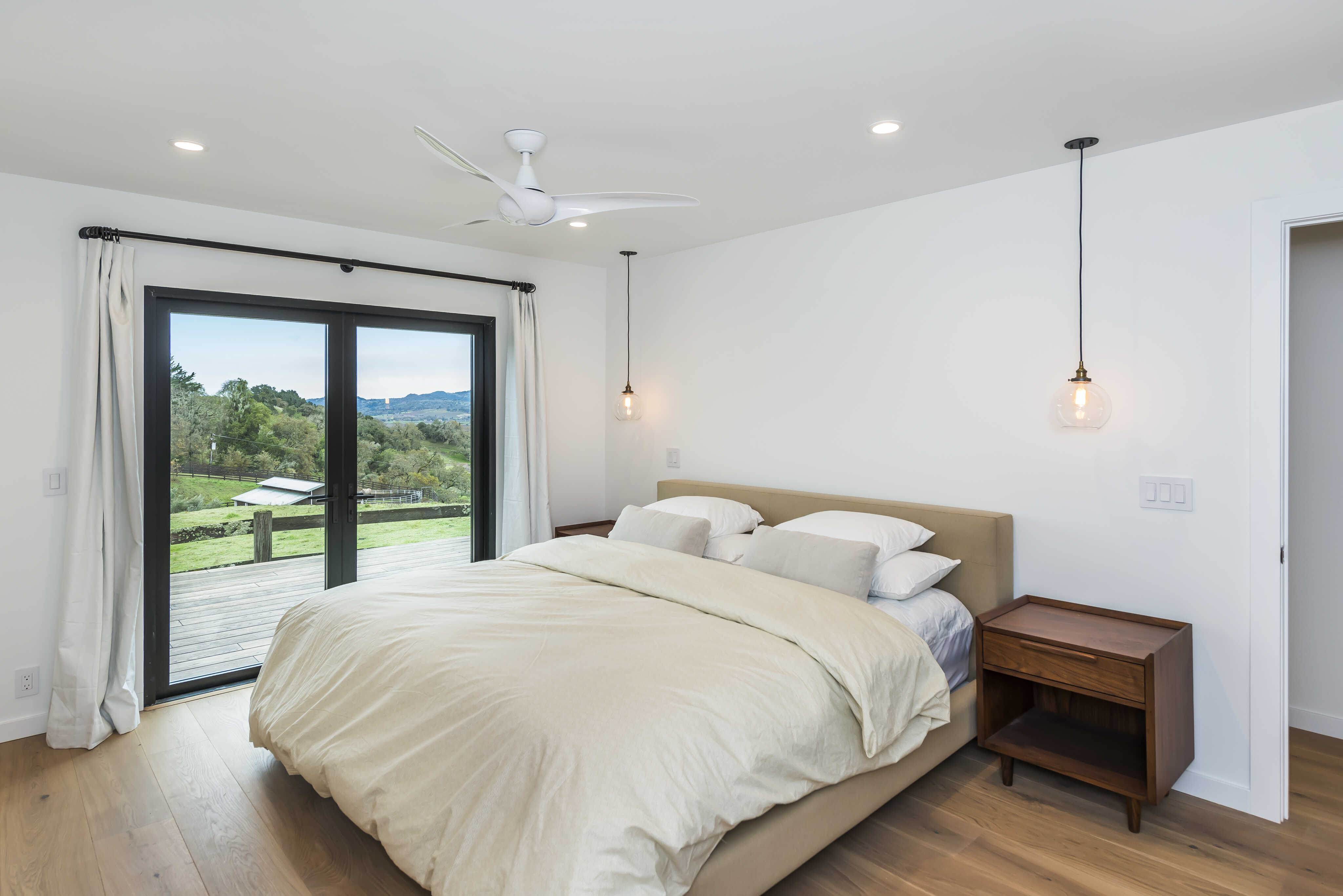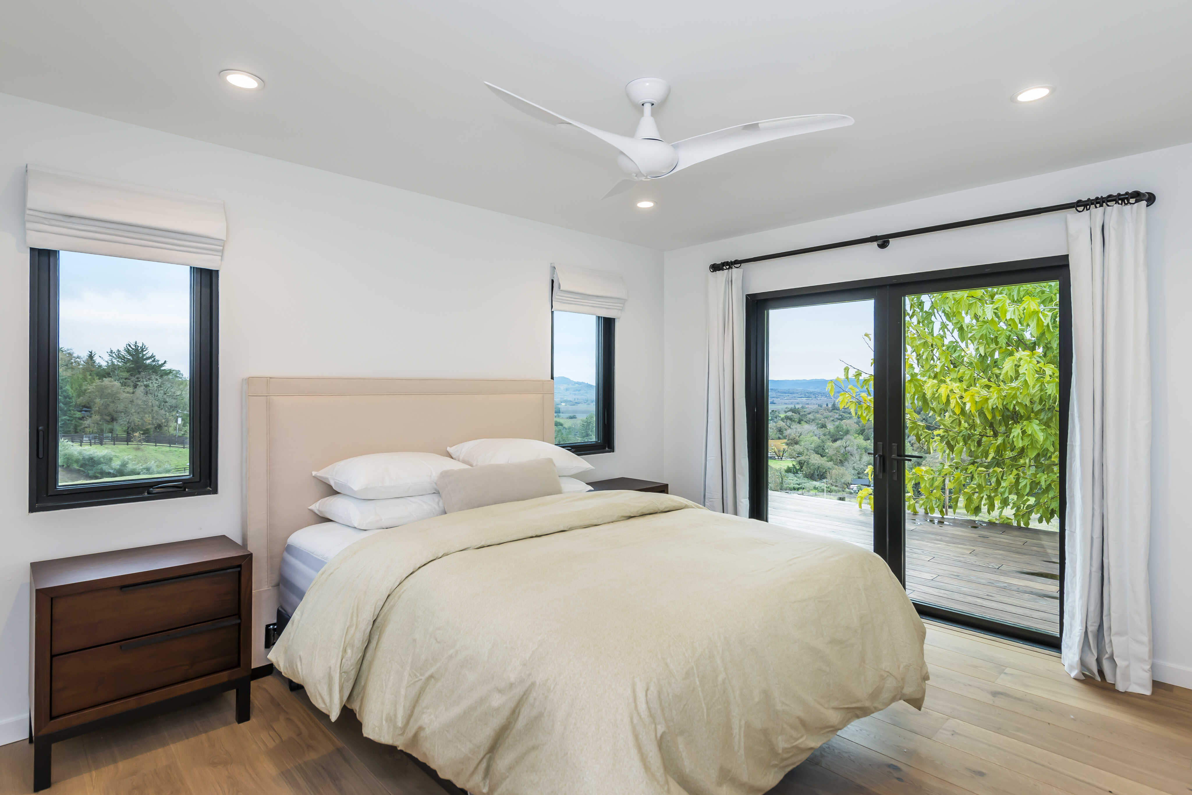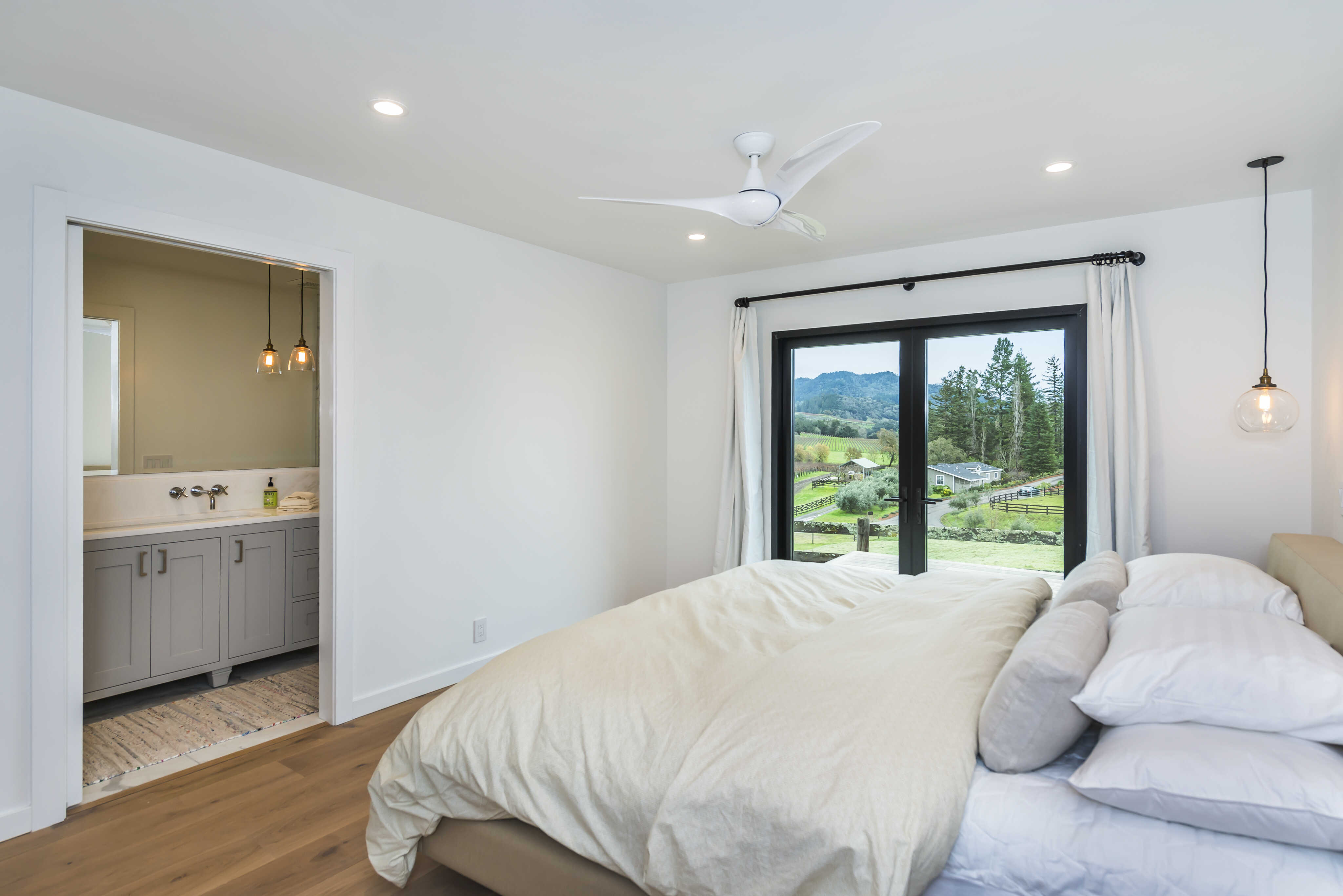 The primary bedroom has a spacious en-suite bathroom with beautiful walk in shower and double sink vanity. A glass slider provides abundant light and access to the patio with beautiful views.