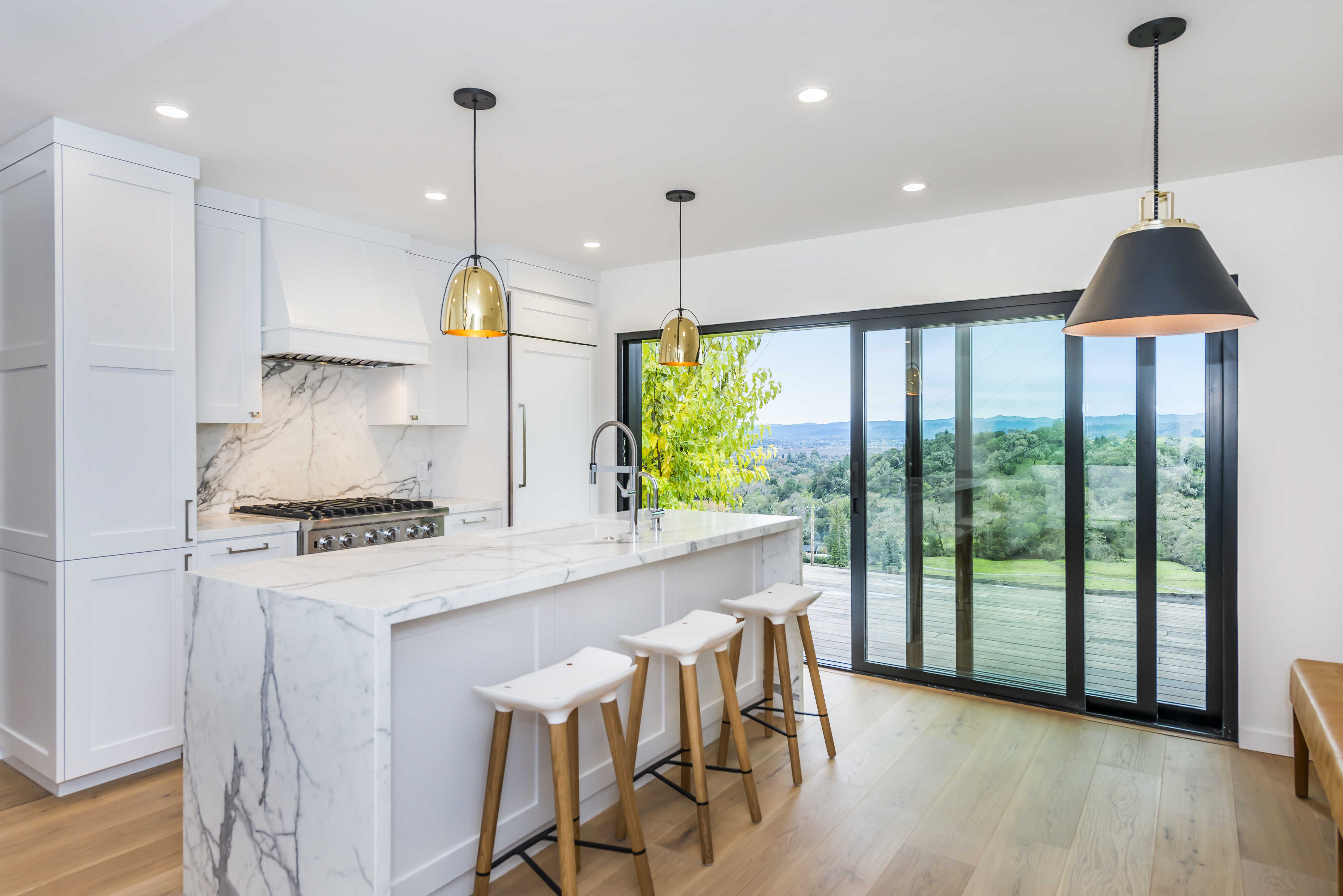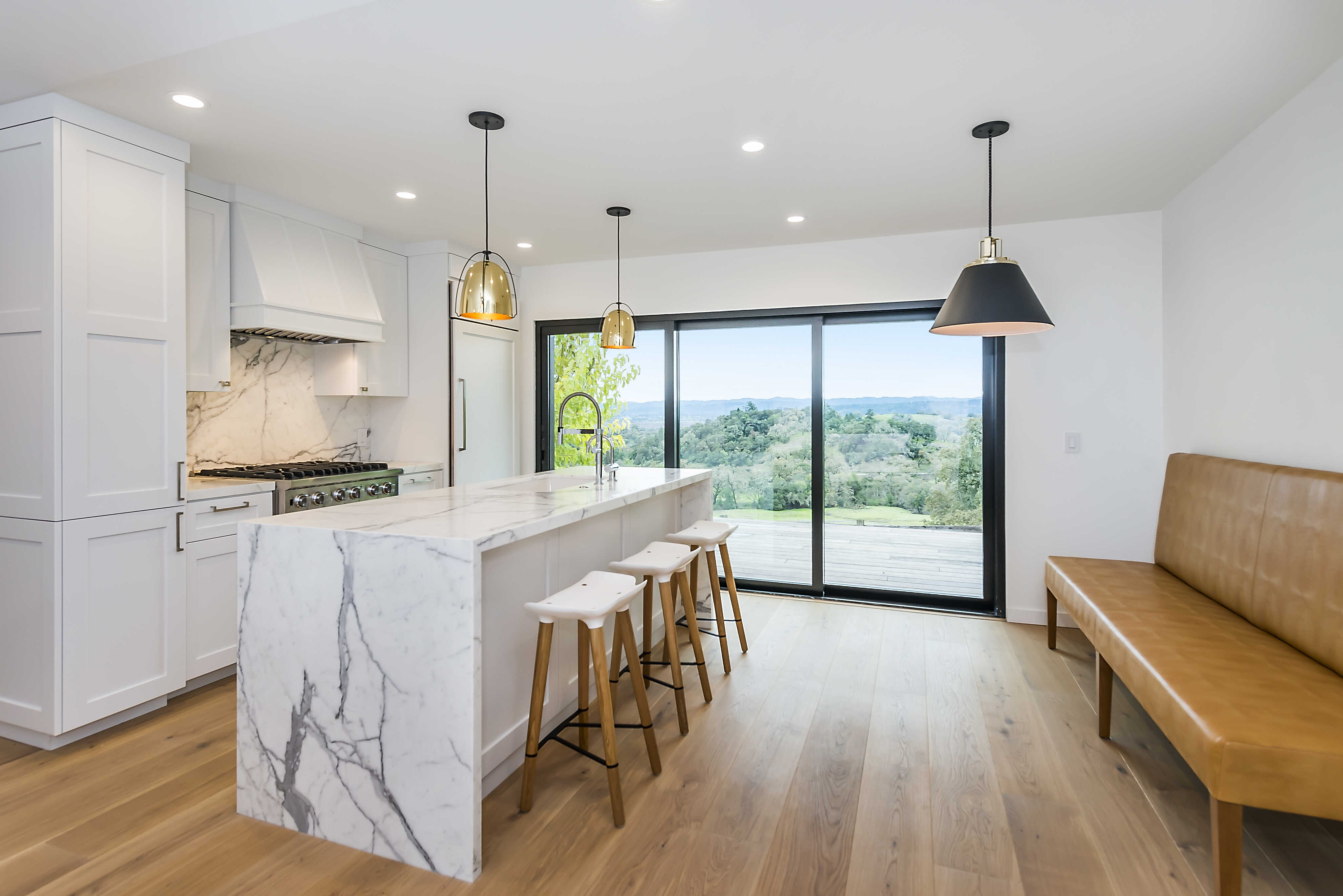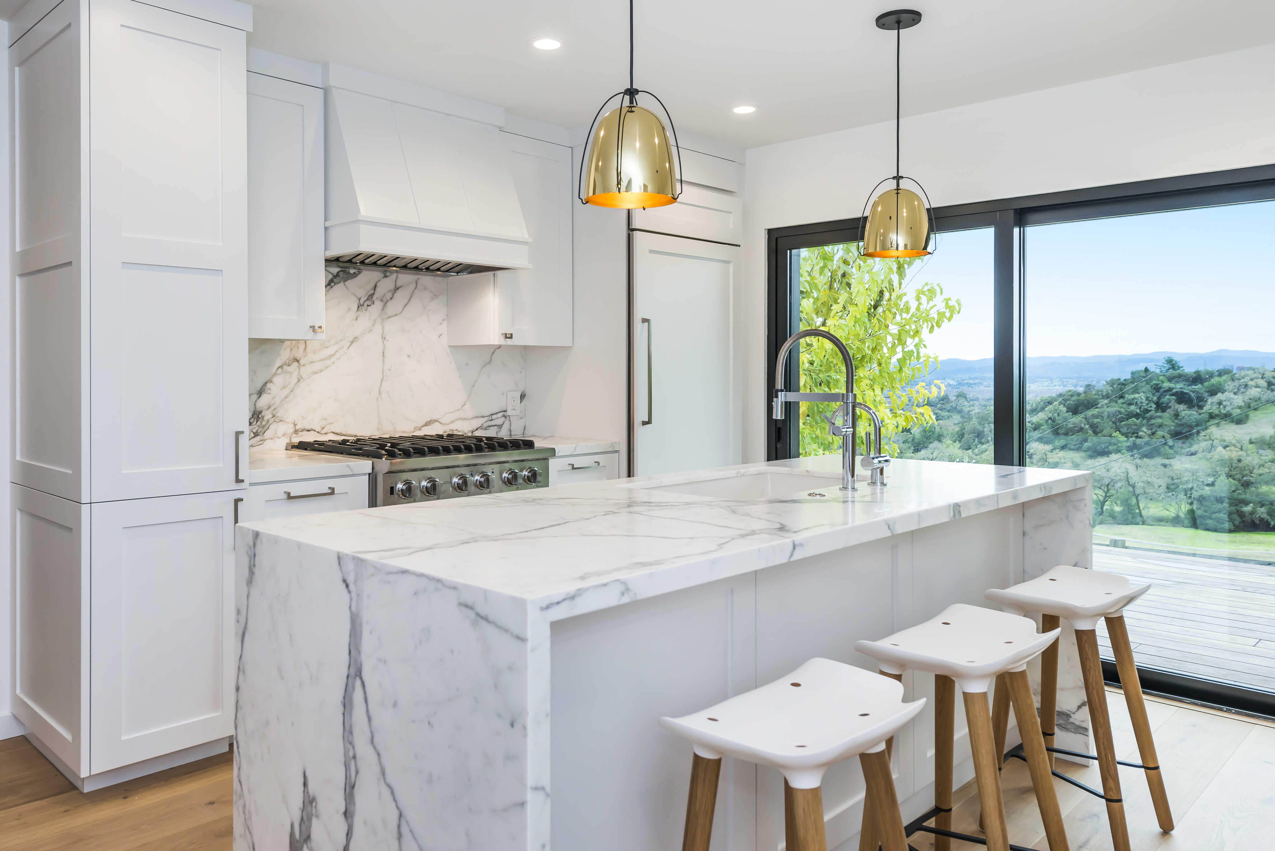 This stunning kitchen has a gas range and large island with additional seating.