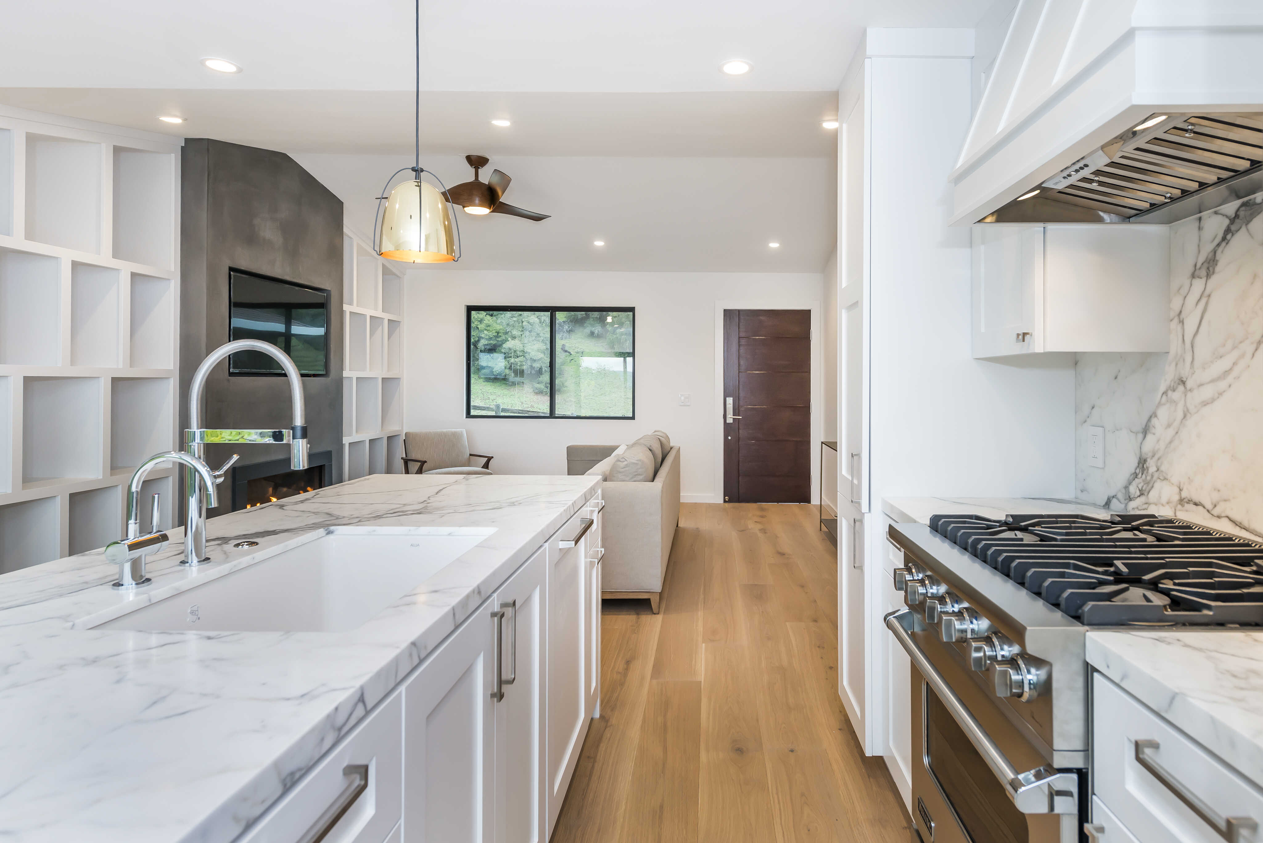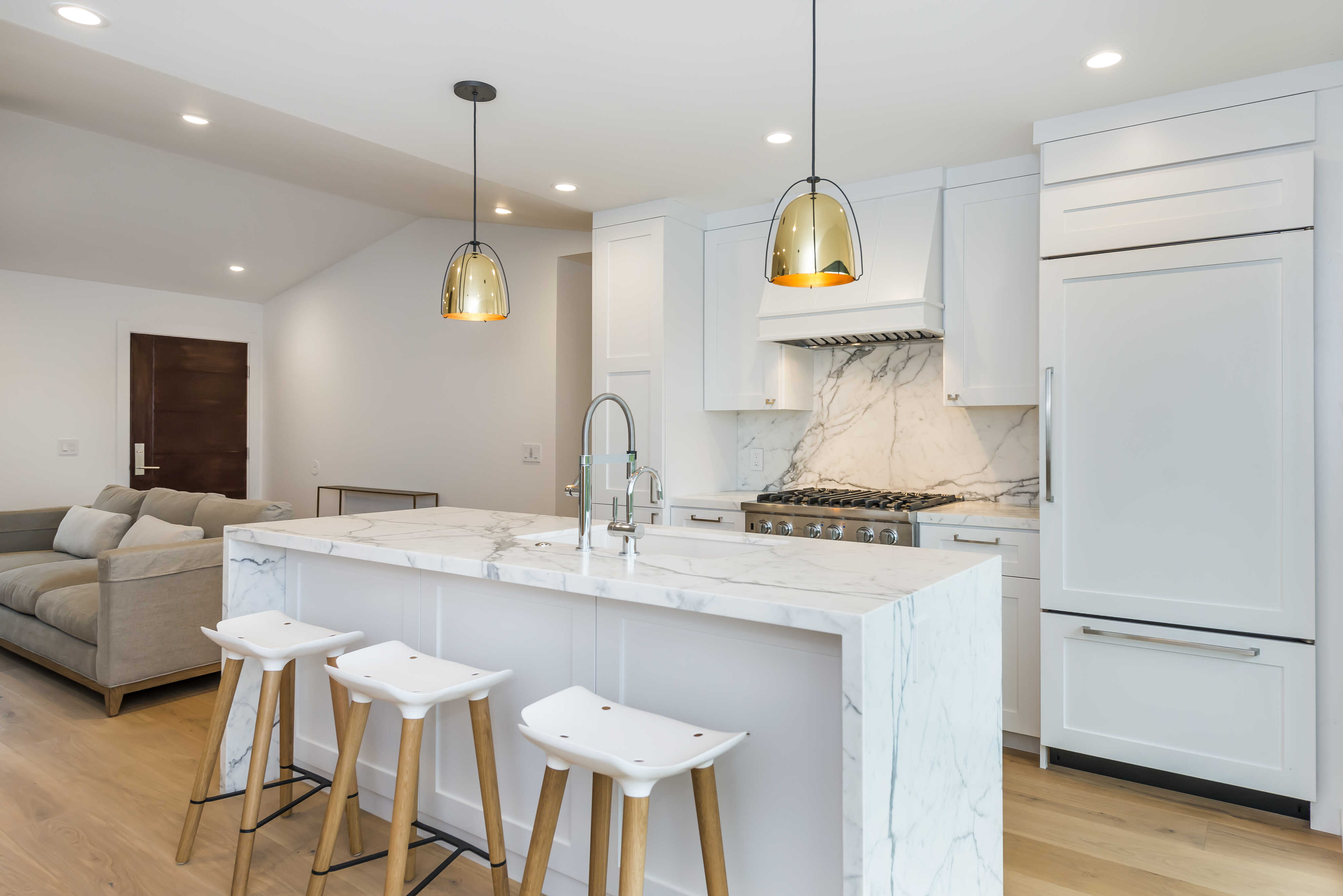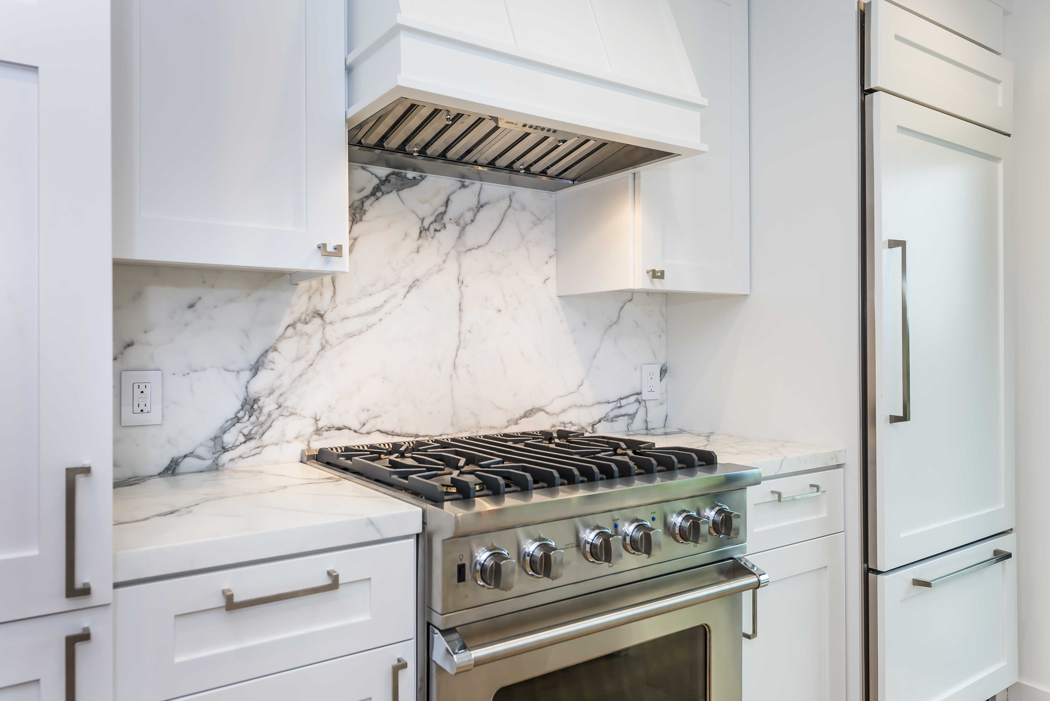 This stunning kitchen has a gas range and large island with additional seating.